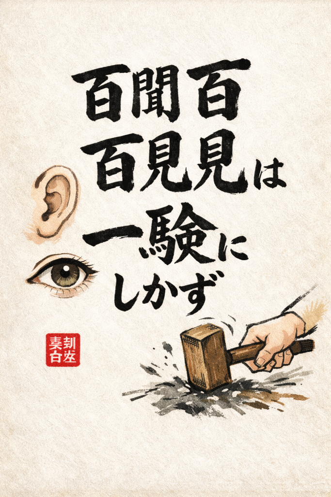 これは、「百聞百見は一験にしかず」という管理人の座右の銘を、ChatGPTさんが画像にしたものです。
